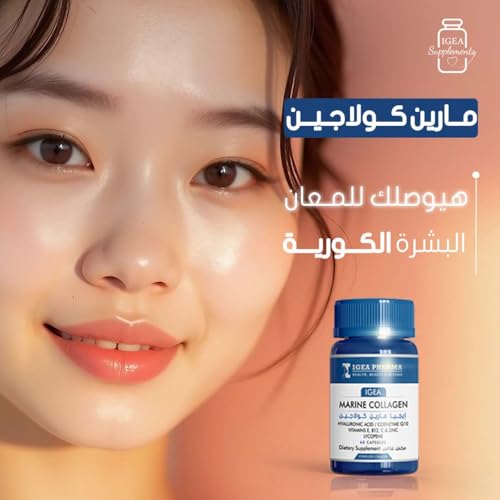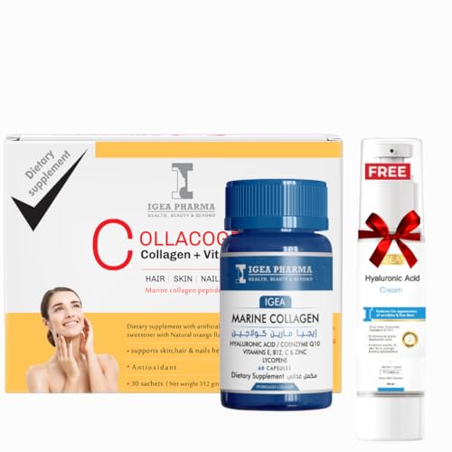 Igea - كبسولات كولاجين بحري 60 كبسولة وكولاجين برتقال 30 كيس وكريم حمض الهيالورونيك (40 ملليلتر) مع فيتامين سي وحمض الهيالورونيك والتجاعيد لتعزيز مرونة البشرة وترطيبها من ايجيا