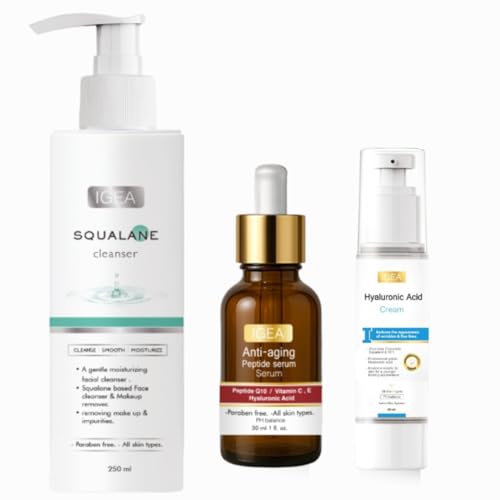 Igea - مجموعة العناية بالبشرة، منظف سكوالين (250 مل) وسيروم ببتيد لمكافحة الشيخوخة (30 مل) وكريم حمض الهيالورونيك (40 مل) لتجديد البشرة وتقليل التجاعيد والخطوط الدقيقة من ايجيا