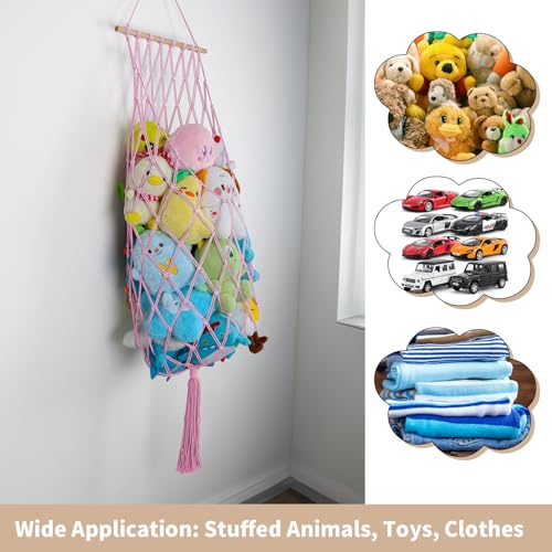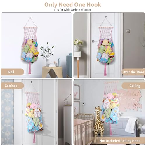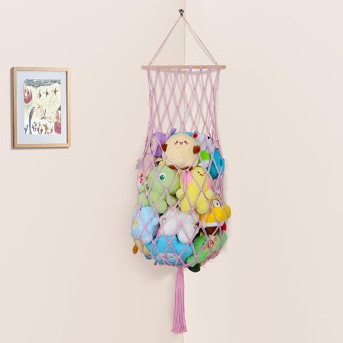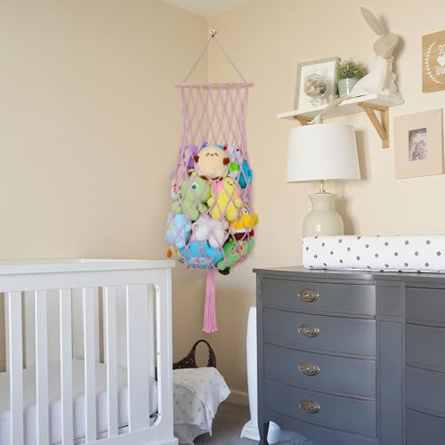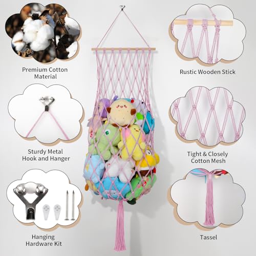 iHansee - 68 Inch Stuffed Animal Storage, Jumbo Macrame Stuffed Animal Hammock Corner, Wall Ceiling Hanging Stuffy Toy Hammock Plushie Net Display for Kids Boys Girls Nursery Decor (Pink)