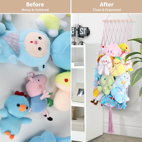 - 【Perfect Balance of Storage & Boho Decoration】: iHansee plushie net with bohemian tassels, is not only a stuffed animal holder for kids room, playroom, bedroom, nursery, preschool, girls' boy's bedroom, but also a unique cute boho room decoration, many colors for your choice. Turn messy toys into a great decoration for your room.