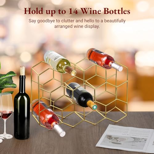 IKITEE - رف مشروبات يوضع على سطح المنضدة، 14 زجاجة، منظم زجاجات نبيذ ذهبي قائم بذاته، حامل تخزين النبيذ لخزانة المطبخ وخزانة المؤن