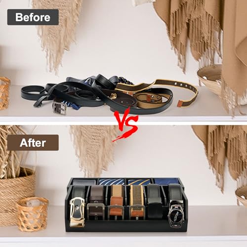 - صندوق عرض عملي وأنيق: الغطاء الأسود ذو اللمسة النهائية الرائعة يبدو أنيقًا للغاية، بلمسة نهائية فاخرة تضيف لمسة من الفخامة إلى دولابك. يمكن وضعه بسهولة على رف دولابك ويجعل تنظيم أحزمتك أمرًا سهلًا للغاية.