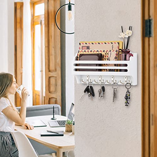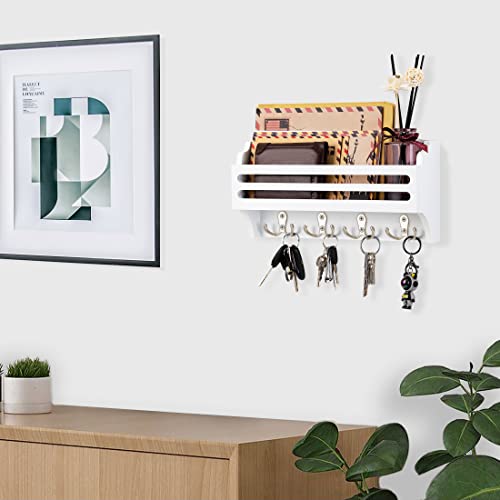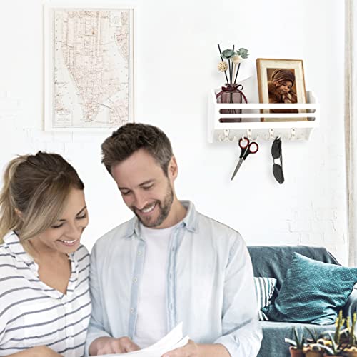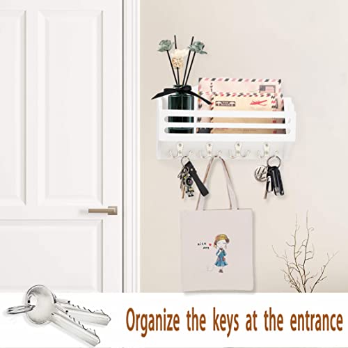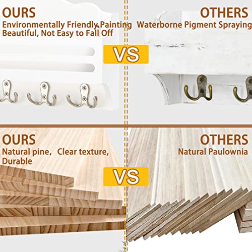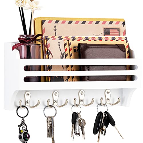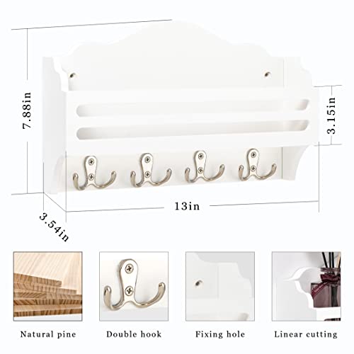 Ikviier - حامل مفاتيح لتزيين الحائط، منظم بريد يثبت على الحائط، خطافات مفاتيح للحائط مصنوع من خشب الصنوبر، حامل مفاتيح وحامل بريد للحائط مع رف، رف مفاتيح للحائط مع خطاف مزدوج، أبيض