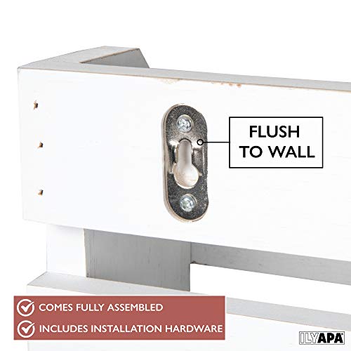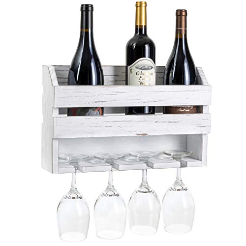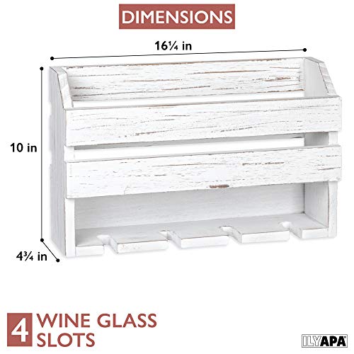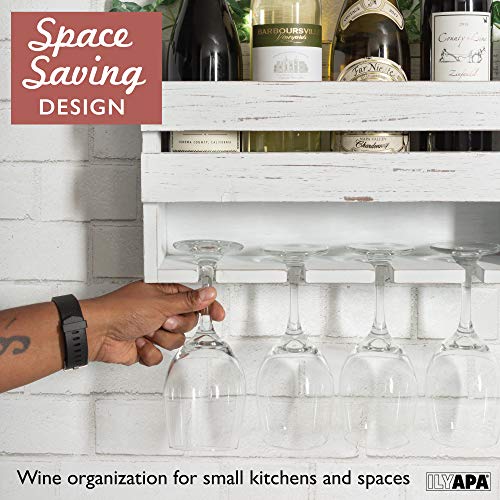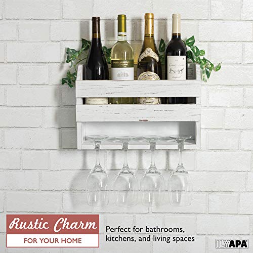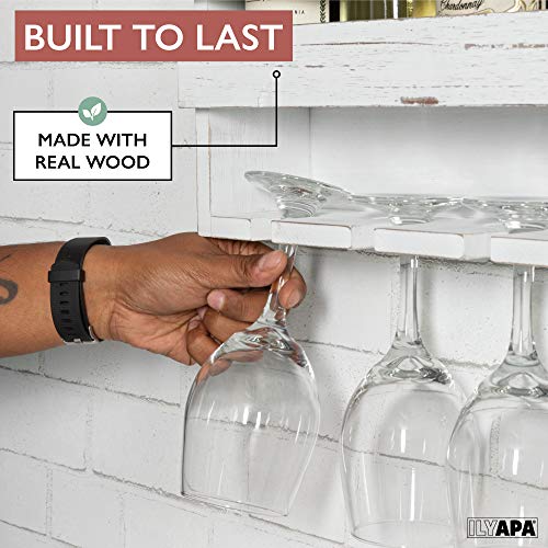 Ilyapa - ايليابا رف نبيذ خشبي ريفي يثبت على الحائط - زجاجات النبيذ و4 حامل اكواب للبار المنزلي والمطبخ وديكور المزرعة (ابيض)