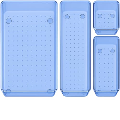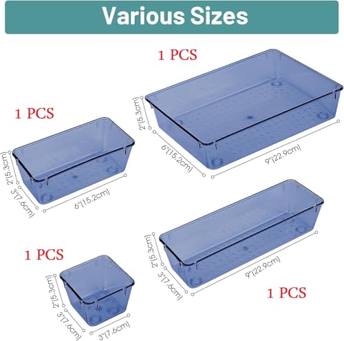 Generic - مجموعة منظمات ادراج اكريليك مستوردة - 4 قطع صواني تخزين شفافة باحجام متعددة، صناديق ادراج الحمام والتسريحة متعددة الاستخدامات للمكياج وادوات المطبخ واكسسوارات غرفة النوم والمكتب (ازرق)