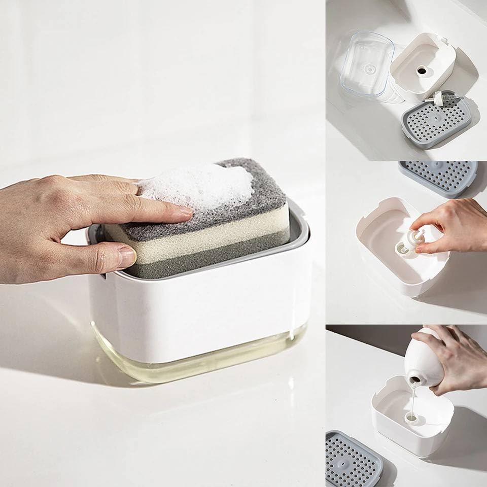 - تصميم مبتكر مزود بإسفنجة عملية مدمجة لتسهيل تنظيف الأطباق والأواني بسرعة، مما يوفر الوقت ويقلل الحاجة لاستخدام زجاجات صابون منفصلة أو أدوات إضافية على الحوض.