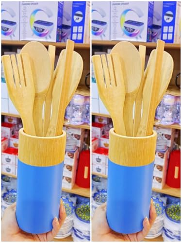 Generic - مجموعة ادوات مطبخ من الخيزران المستورد - 6 قطع من ادوات الطبخ الخشبية مع حامل | صديقة للبيئة، حجم كبير، متينة، مثالية للتحريك والتقديم والطبخ (عبوتان (12 قطعة))