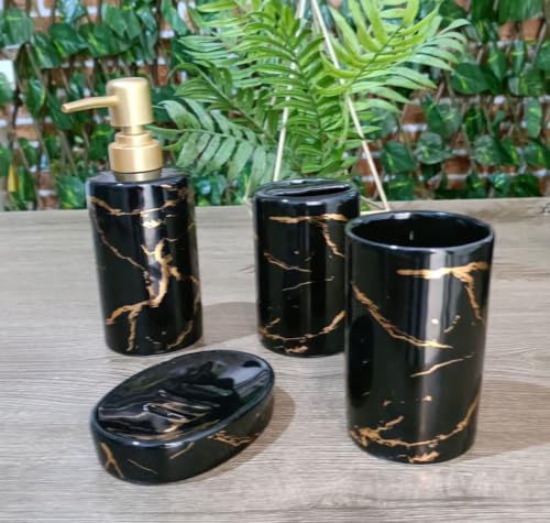 Generic - طقم حمام مُربّع بورسلين مُستورد - جودة عالية، أسود وأبيض، 4 قطع متنوعة بديكور أنيق لحمام مستوحى من الموضة: ديسبنسر، صبانة مرتبة، علبة م - من جينيريك