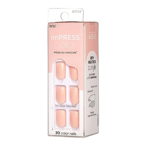 imPRESS - اظافر امبريس ملونة بالضغط من كيس، مجموعة اظافر جل بتقنية بيور فيت، قصيرة الطول، "بيفيش بينك"، طلاء اظافر بلون سادة خال من التلميع، تتضمن وسادة تحضير، مبرد اظافر صغير، عصا للزوائد اللحمية، 30 ظفر صناعي