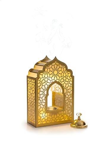 Generic - مبخرة بتصميم اسلامي - مصباح بتصميم مسجد محراب فاخر مع اضاءة LED، قاعدة خشبية متينة وبريق معدني ذهبي، مناسبة لديكور رمضان الراقي، مقاس 25 × 16 سم