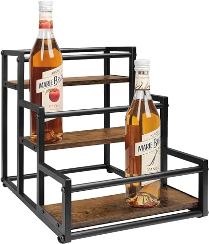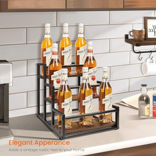 INDIDECOR - رف منظم لزجاجات شربات القهوة حامل يتسع لـ 12 زجاجة شراب تخزين من 3 طبقات العصائر والشربات يوضع على سطح الطاولة والمطبخ والمقهى لون بني معتّق وأسود انديديكور 11136 معدن.