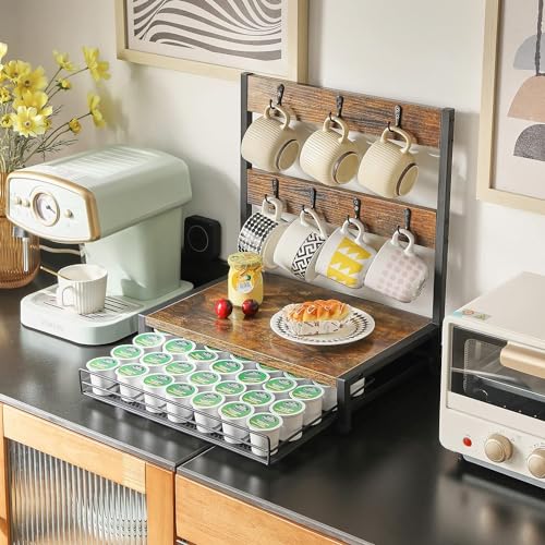 INDIDECOR - حامل مجات قهوة مزود بدرج لكبسولات القهوة من انديدكور، سعة 35 كبسولة، منظم مع خطافات للمجات، حامل مجات من طبقتين للوضع علي سطح الطاولة، موديل 48468