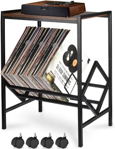 INDIDECOR - حامل مشغل الأقراص مع تخزين يتسع حتى 80 ألبومًا من انديكور، حامل دوار مع أرجل معدنية سوداء غير لامعة، طاولة مشغل أقراص لغرفة المعيشة أو غرفة النوم أو المكتب، 61864