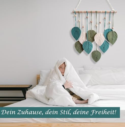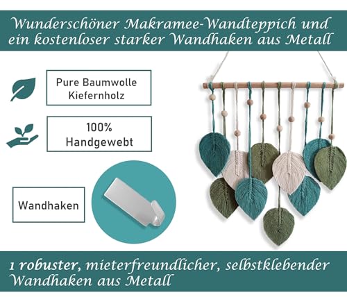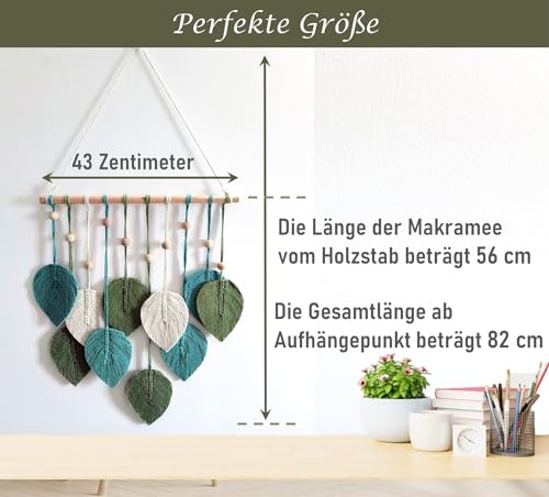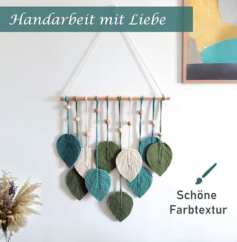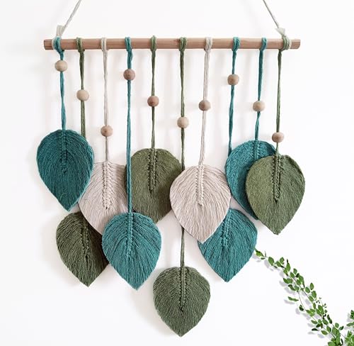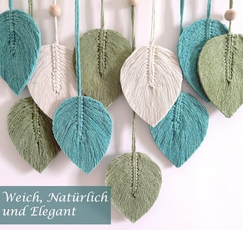 - مكرمية بتصميم أوراق شجر للتعليق على الحائط مصنوعة يدويًا من خيوط القطن الطبيعي النقي والخشب. يتميز هذا النسيج بملمس رائع من أنماط ديكور الحائط باللون الأخضر والأخضر مريمي والبيج، ومناسب للديكور البسيط العصري أو التصميم البوهيمي.