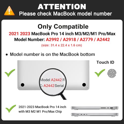 - ✅ التوافق: الجراب الصلب وغطاء الكيبورد متوافقان فقط مع ماك بوك برو 14 بوصة 2021 2023 (M1/M2 برو ماكس)، موديل A2442/A2779.