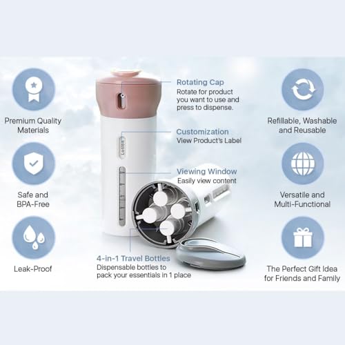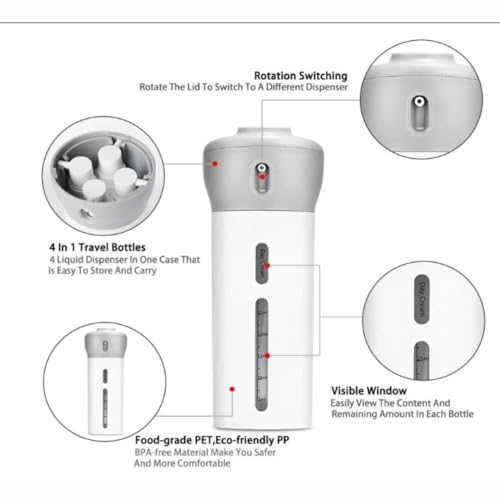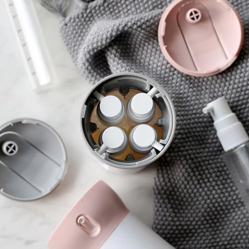 - نظام توزيع دوار: تتيح آلية الدوران سهلة الاستخدام الوصول بسهولة إلى أي من الزجاجات الأربع دون عناء فك الأغطية. تعزز هذه الميزة العملية الراحة، مما يجعل التبديل بين أدوات النظافة المختلفة أثناء رحلتك أمرًا سهلاً.