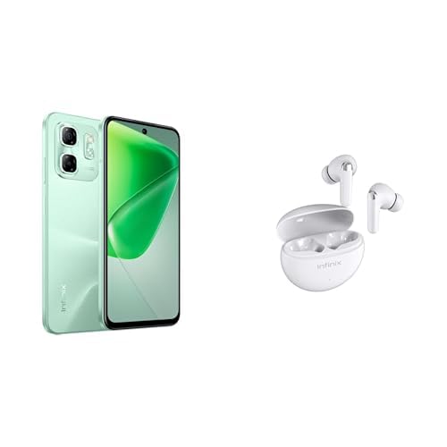 Infinix - موبايل هوت 50i شبكة الجيل الخامس 5G لون ساجا جرين، سعة تخزين 256 جيجابايت، ذاكرة رام 8+8 جيجابايت + سماعات أذن انفنيكس XE26 ترو اللاسلكية من انفنيكس، أبيض