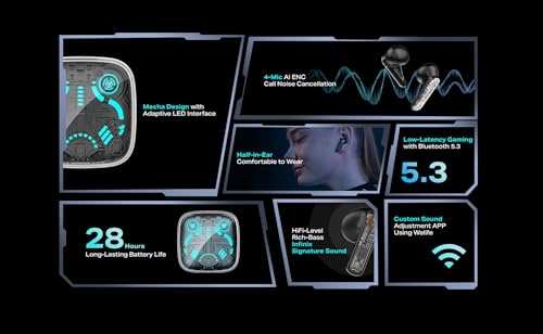 Infinix - سماعة أذن بلوتوث لاسلكية مقاومة للماء بتصنيف IPX4، مكالمات وصوت واضح مزودة بـ 4 ميكرفونات، بتقنية إلغاء الضوضاء المحيطة، مدة تشغيل البطارية 28 ساعة XE30 من انفينيكس، XBuds 3GT - أسود