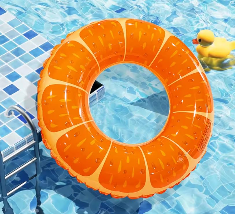- التصميم: عوامة حمام السباحة بتصميم شرائح برتقال جذابة تتميز بألوان برتقالية وصفراء نابضة بالحياة، مثالية للاستمتاع بالصيف.