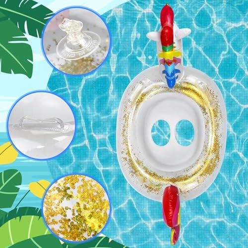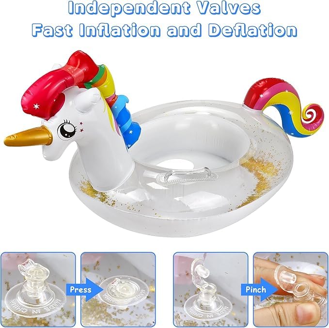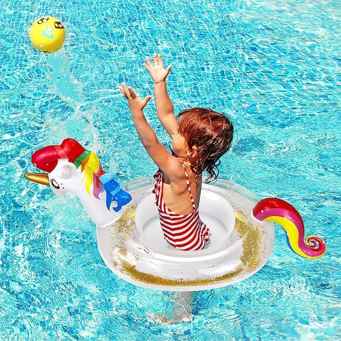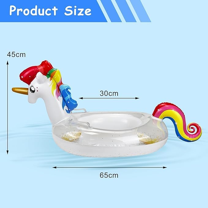 - التصميم: عوامة حمام سباحة على شكل يونيكورن خيالي تتميز بعرف بألوان قوس قزح الزاهية وتفاصيل قرن ذهبي، مثالية لمتعة الصيف.