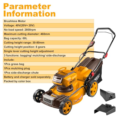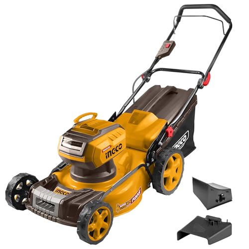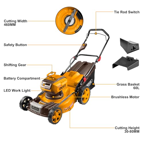 Ingco - جزازة عشب لاسلكية 40 فولت (الهيكل فقط) بمحرك عديم المسفرات من انجكو، عرض القطع 46 سم، شنطة تجميع 60 لتر، 8 إعدادات عمق LMLI20185
