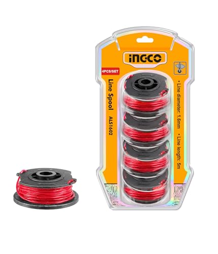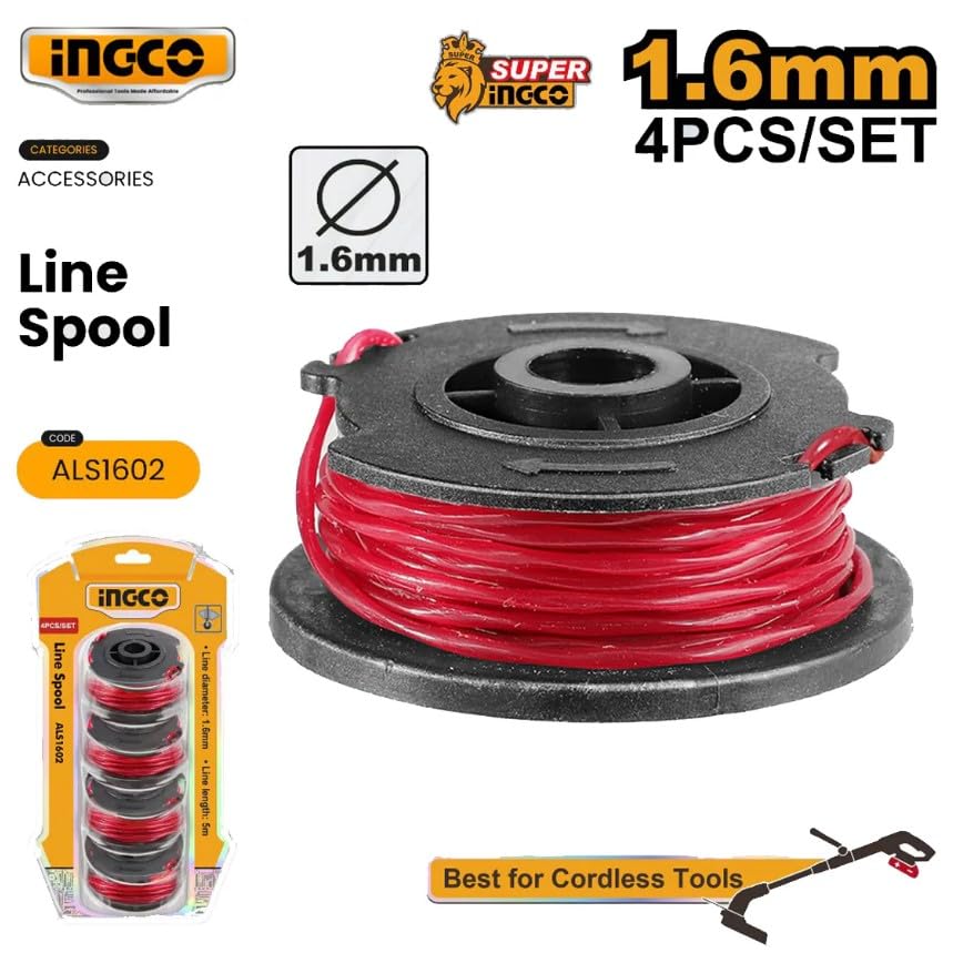 Ingco - انجكو بكرة خيط بديلة لماكينة تشذيب العشب اللاسلكية، 4 قطع (قطر الخط 1.6 ملم × طول 5 متر) - الموديل: ALS1602