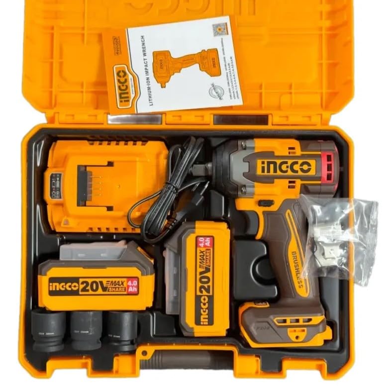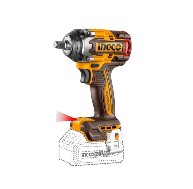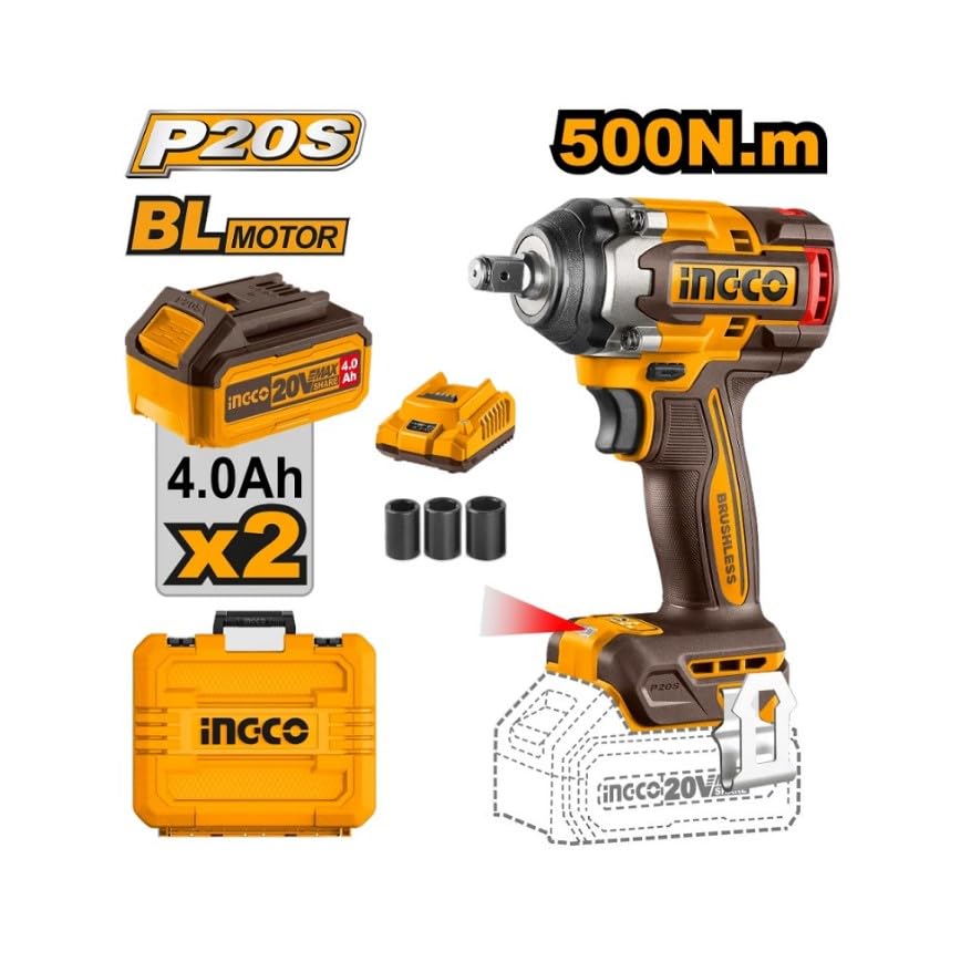 Ingco - شنيور فك وربط ببطارية ليثيوم آيون CIWLI2050 بمحرك 20 فولت عديم المسفرات من انجكو، محرك مربع: 1/2 بوصة، عزم التثبيت: 500 نانومتر، مصباح عمل مدمج، بطاريتان 4.0 أمبير في الساعة مع شاحن