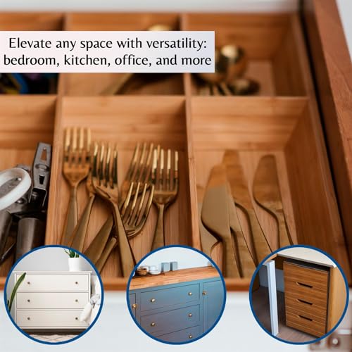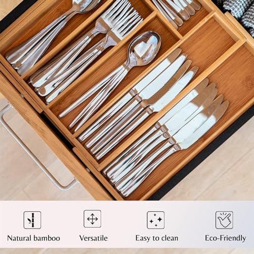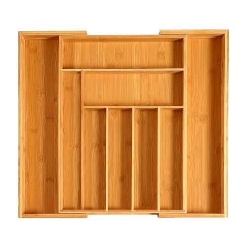 Innoteck - صينية ادوات مائدة اسنشيالز من الخيزران قابلة للتوسيع من انوتيك مع 9 مساحات تخزين خشبية مقسمة وحامل - حل تخزين انيق وقابل للتعديل للاستخدام في المطبخ والمنزل والمكتب، بني