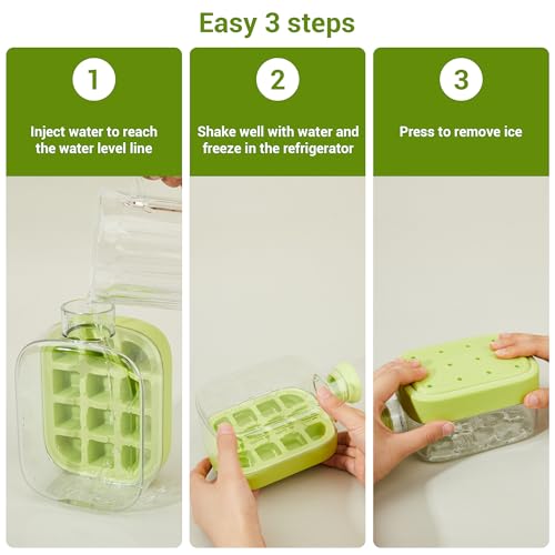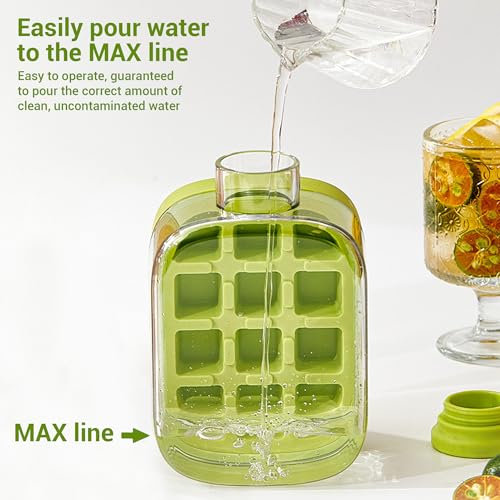 - زجاجة قوالب ثلج فريدة من نوعها تعمل بالضغط - تستخدم زجاجة مكعبات الثلج هذه آلية ضغط لإطلاق مكعبات الثلج بسرعة في غضون ثوانٍ قليلة. ما عليك سوى الضغط على منتصف الغطاء بكلتا يديك لإخراجه بسهولة، وستسقط مكعبات الثلج في قاع الكوب. لا تملأها بالماء أكثر من اللازم (املأها حتى خط الحد الأقصى).