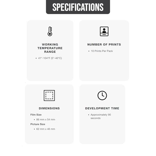 - تنتج صورًا فورية بحجم بطاقة الائتمان، مقاس الطباعة 54 (العرض) × 86 9 (الارتفاع) ملم، مقاس الصور 46 (عرض) × 62 (ارتفاع) ملم