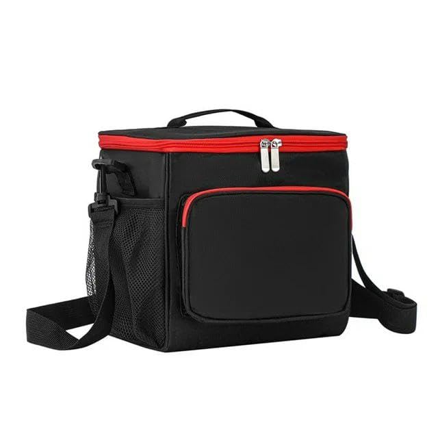 - حقيبة غداء عملية: حقيبة لانش باج بتصميم أنيق باللون الأسود مع حواف حمراء، مزودة بسوستتين للإغلاق المحكم والوصول السهل للمحتويات