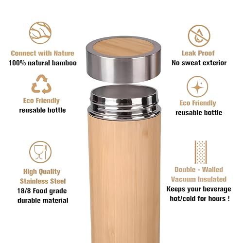 - تتميز هذه الزجاجة المزدوجة الجدران المصنوعة من الستانلس ستيل والخيزران بعزل مفرغ، مما يحافظ على المشروبات ساخنة لمدة تصل إلى 12 ساعة أو باردة لمدة 9 ساعات، مما يجعلها مثالية للقهوة الساخنة والمشروبات الباردة أثناء التنقل.