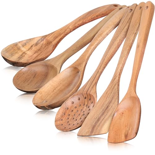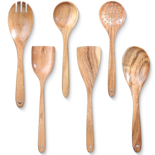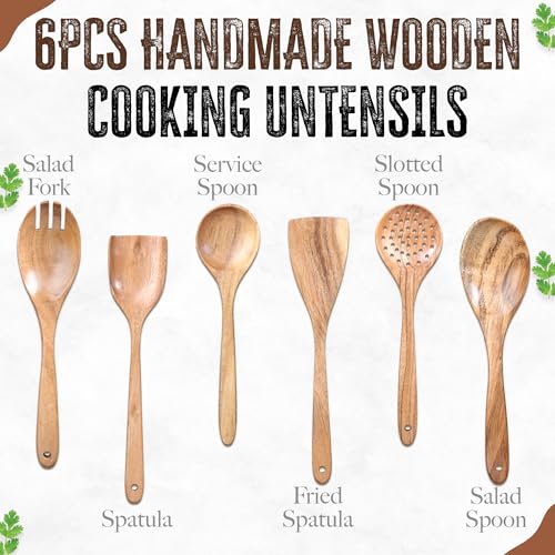 INTAJ - معالق خشبية للطبخ مكونة من 6 قطع من انتاج، أدوات الطبخ الخشبية، معالق تقديم، ملعقة سلطة، شوكة سلطة، مقصوصة، معالق سباتولا غير لاصقة