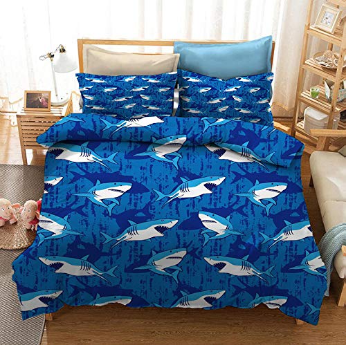 IOWLDMW - طقم سرير مقاس مزدوج بتصميم سمكة قرش كرتونية باللونين الأزرق والأبيض مقاس 2×2 متر مع سوستة إغلاق سهل العناية مع 2 كيس مخدة (50×75 سم)، الألياف الدقيقة، متعدد الألوان