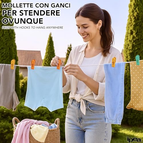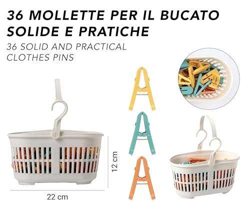 IPEA - مشابك غسيل مع سلة بلاستيكية من ايبيا – 36 قطعة – خفيفة جدًا ومزودة بخطافات – مشابك ملونة مع سلة لتعليق ونشر الملابس، المفارش، الإكسسوارات على حبل الغسيل