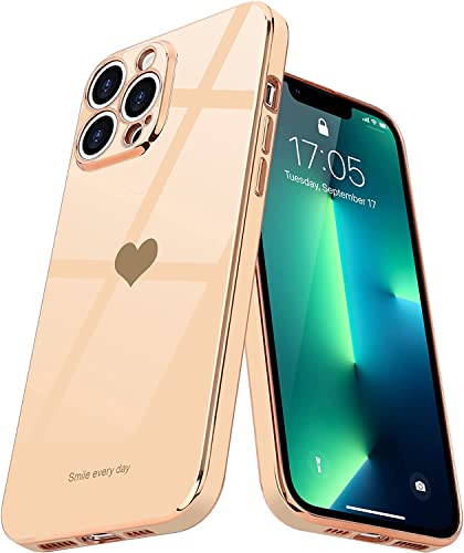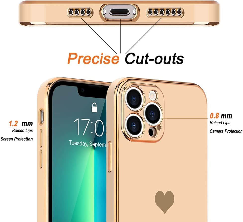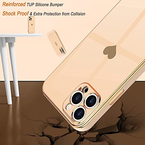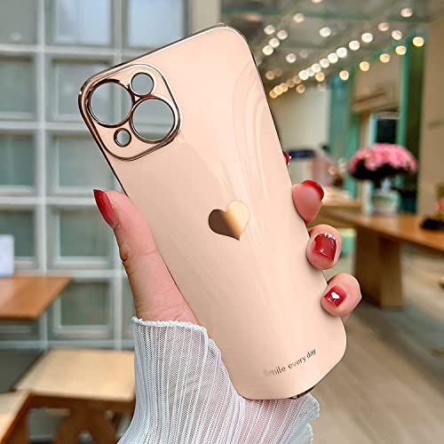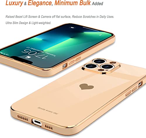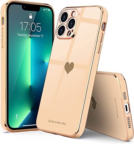 Generic - جراب خلفي لموبايل ايفون 14 برو ماكس مضاد للصدمات من السيليكون الناعم مع حافة مرتفعة لحماية الكاميرا مطلي كهربائيًا بالبلينج بتصميم قلب لطيف للنساء والبنات لون روز جولد شفاف
