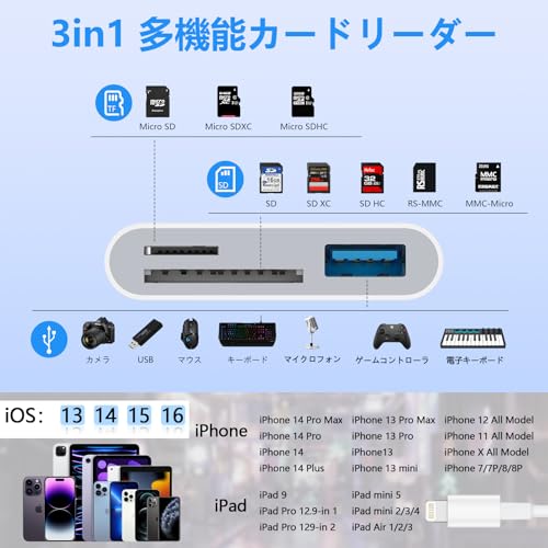 - 【قارئ بطاقات SD 3 في 1】: يدعم قارئ بطاقات SD آيفون 3 في 1 TF/SD/USB. منفذ بطاقة SD (SD / SDHC / SDXC / RS-MMC / MMC- بطاقة مايكرو)، منفذ بطاقة TF (بطاقة مايكرو/ شريحة Micro SD / Micro SDHC / Micro SDXC)، منفذ USB (USB 3.0 / 2.0) يدعم TF/SD/USB حتى 1 تيرابايت ليحل مشكلة قلة سعة التخزين في هاتفك الذكي. ملاحظة: لا يمكن استخدام قارئ بطاقات SD/TF وموصل USB في نفس الوقت