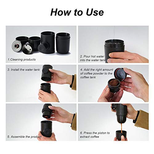 - [سهلة التركيب] أضف الماء المغلي إلى خزان المياه الخاص بك. ثم استخدم المكبس لحقن الماء في محول القهوة. بعد عدة ضغوط، يتم الوصول إلى ضغط الاستخراج الأمثل واستخراج إسبريسو قوي.