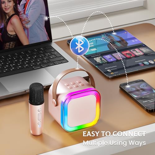 IROO - جهاز كاريوكي ميني للأطفال، للبنات من سن 4 إلى 12+ سنة، مكبر صوت بلوتوث محمول مع ميكروفون لاسلكي واحد لحفلات الأطفال (ذهب وردي) من ايرو