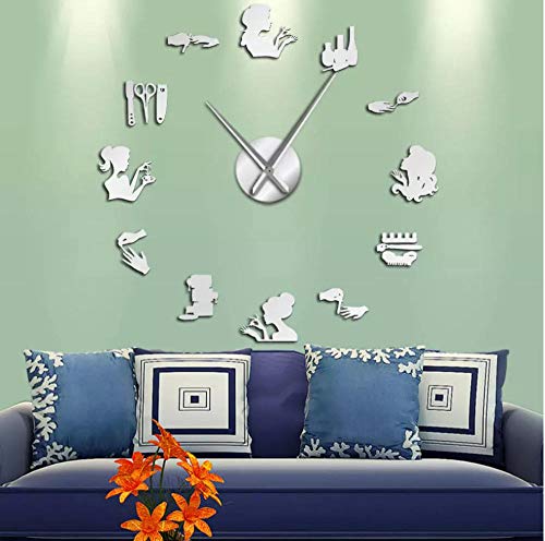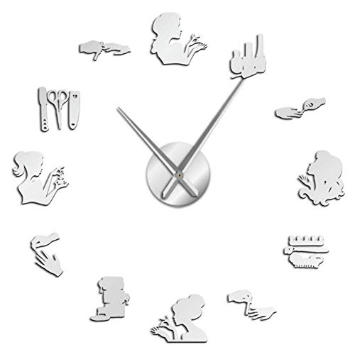 Iselezm - ساعة حائط من ايسيليزم مثالية لديكور صالونات التجميل تتضمن ملصقات جدارية بتصميم ادوات عناية بالاظافر ومانيكير الاكريليك الجدار الذي تصنعه بنفسك- فضي- 47 بوصة تناظري
