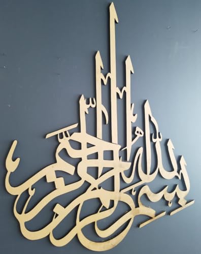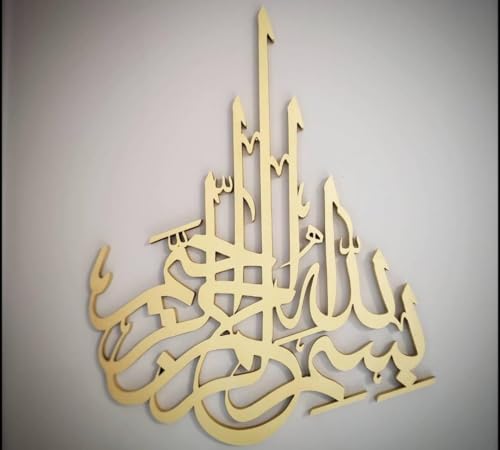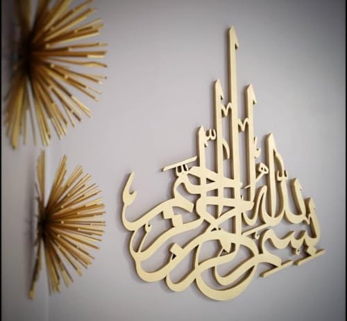 - تصميم فاخر: لوحة فنية جدارية إسلامية حديثة ثلاثية الأبعاد تتميز بكتابة بسم الله بخط أنيق، مصنوعة من معدن عالي الجودة بلمسة نهائية ذهبية لديكور المنزل الراقي.