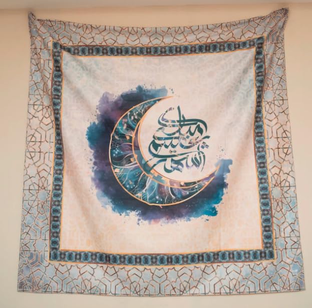 Generic - بساط حائط مخملي بنمط الخط الاسلامي مع هلال وحدود هندسية باللونين الازرق والبيج، مقاس 140 × 140 سم