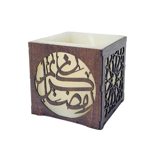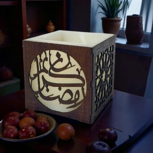 Generic - شمعة مكعبة بغطاء خشبي مفرغ بنقوش إسلامية وهندسية، تصميم رمضان كريم، ديكور منزلي