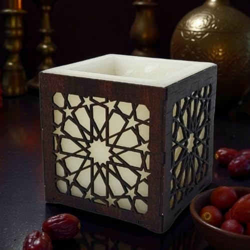 - تصميم إسلامي فاخر: شمعة مكعبة مزينة بغطاء خشبي مفرغ يحمل نقوش عربية إسلامية وهندسية تقليدية تضفي لمسة روحانية وجمالية على المكان