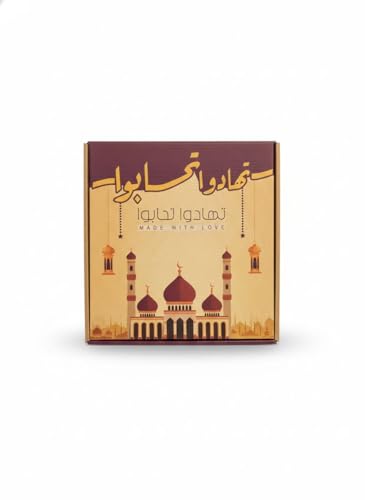 - صندوق هدايا إسلامي فاخر: تصميم أنيق يتميز بزخارف المسجد والفوانيس التقليدية مع عبارة "مصنوع بحب" المميزة، مثالي لتقديم الهدايا في المناسبات الإسلامية
