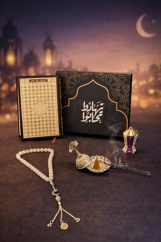 - مجموعة هدايا إسلامية كاملة: تتضمن القرآن الكريم ومسبحة صلاة أنيقة (تسبيح)، وبخور بخور فاخرة مع حامل، وفانوس مزخرف، جميعها منسقة بعناية في صندوق واحد فاخر