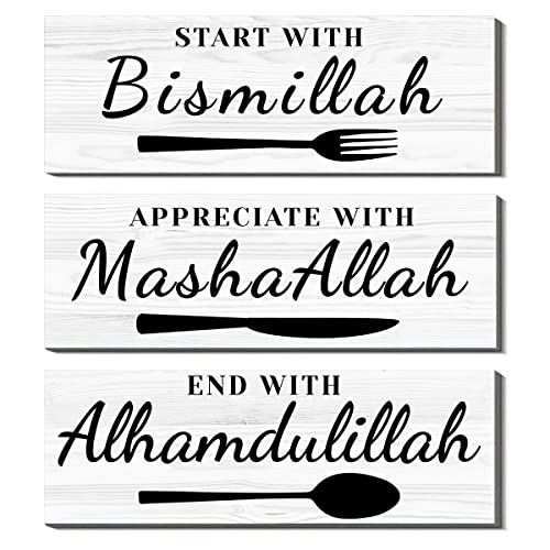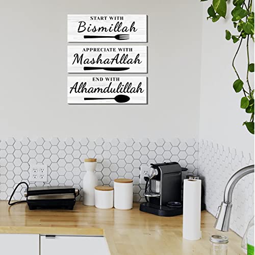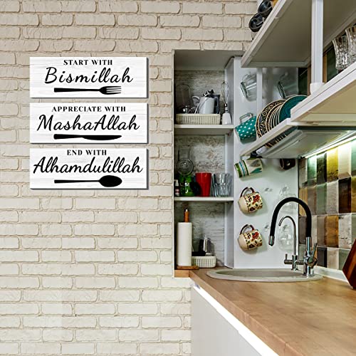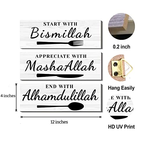 Dazingart - لوحة فنية جدارية خشبية بتصميم اقتباس إسلامي "Start with Bismillah، Appreciate with MashaAllah، End with Alhamdulillah" ديكور حائط خشبي بنمط ريفي بالخط العربي لافتة مطبخ بتصميم إسلامي للديكور (أبيض)