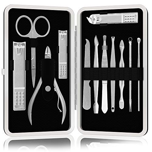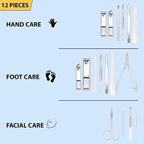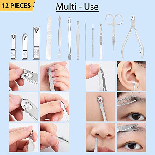 iSOUL - مجموعة مانيكير احترافية من الفولاذ المقاوم للصدأ للرجال والنساء قصافة أظافر مع حافظة للسفر الجلد الصناعي ايسول 12 قطعة لون فضي