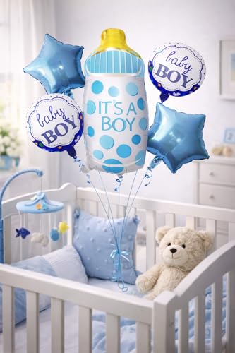 - مجموعة بالونات احتفالية: تتضمن 5 بالونات فويل بتصاميم متنوعة للاحتفال بقدوم المولود الجديد بما في ذلك بالون على شكل زجاجة حليب كبيرة وبالونات نجمية وبالونات دائرية