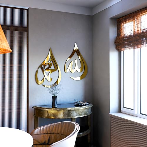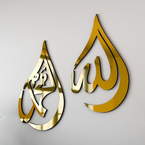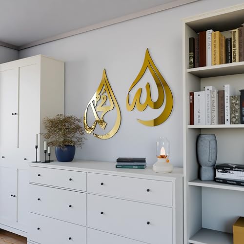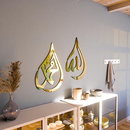 iwa concept - لوحات جدارية من ايوا كونسبت، ديكور إسلامي معلق على الحائط لغرفة المعيشة وغرفة الصلاة، تصميم كلمة الله ومحمد، لون ذهبي، مقاس 30.48 × 20.32 سم